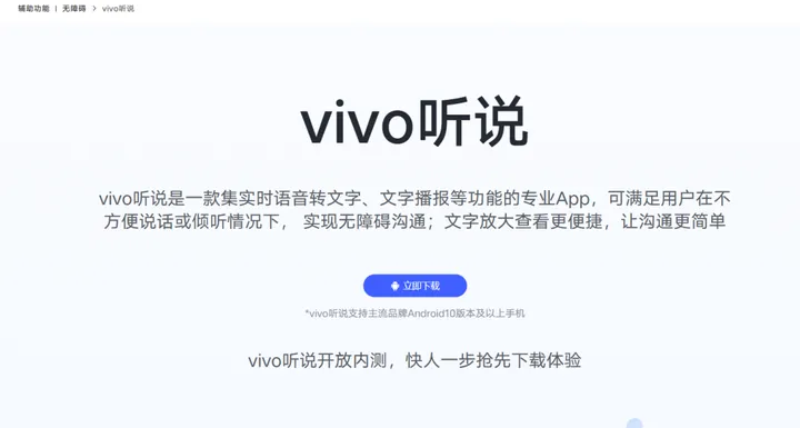 vivo听说是vivo开发的无障碍工具,可将沟通中的语音实时转换为文本,以满足某些特殊场景下的沟通交流需要。
