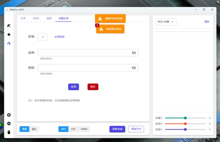 软件还分别内置了一个开发者提供的付费接口和微软Azure语音合成服务的调用界面,需要付费购买或者自行登录微软Azure服务。这里就以免费服务为主,来给大家展示软件的使用~