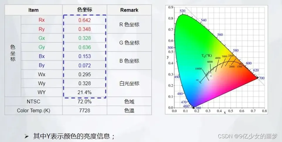 1931CIE-RGB 系统:运算过程复杂,也无需了解;任何一种颜色都可以用三原色的量,即三刺激值来表示,选用不同的三原色,对同一颜色将有不同的三刺激值。为了统一颜色表示方法,CIE对三原色做了规定。规定R、G、B三原色的波长分别为:700nm.5461nm、435.8nm,R G B的单位三刺激值的光亮度比为 1.000:4.5907:0.0601。以色光加色法中红绿、蓝三原色光等比例混合结果为白光,我们LCD常用的RGB颜色系统;
