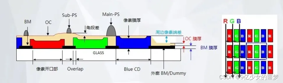 LCD用的 CF 的组件主要包括玻璃基板、黑色矩阵(Black Matrix,简称 BM)、彩色层(ColorLayer,包括R(红)、绿(G)、蓝(B)三种颜色、保护层(Over Coat,简称O/C):对于TN类型产品,顶层还有ITO: