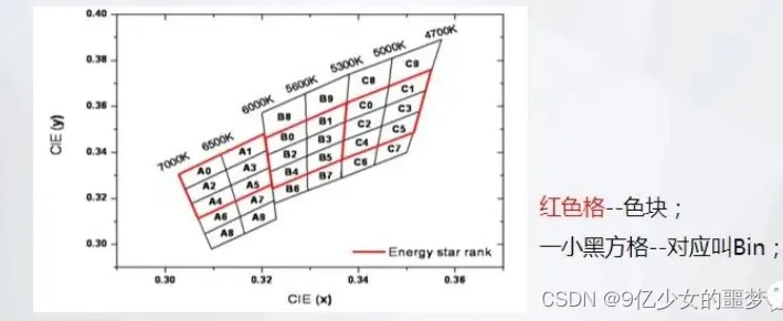其中LED灯制造过程,颜色不可能全部集中在一个颜色,均有上下波动,因此一般要求是中心色块(也就是色温中心值),周边颜色称之为角色块,如果我们全要中心色块,LED良率损失较大,因此我们会上下波动色块都验证,并混色块使用,不同的厂商对应有不同的色块命名方式Bin:就是按色温段来区分LED。色块是一个区域,在这个区域里面细分成更小的区域,这个更小的区域,就是LED的分Bin;不同的Bin对应的色温略有差异,都在同一个色块里面分bin:灯珠封装完成后,每个灯珠个体间会有差异(光强、光色、VF值),需要根据这三种参数进行分类,然后再打上参数标签,最后区分包装。这个工序叫分bin。