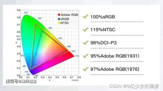 1、NTSC:NTSC是美国国家电视标准委员会,他们所推出的NTSC电视标准是一套广播电视传输协议被运用在美国、日本等国家的广播电视系统中。当然这也就意味着,NTSC色彩空间更多被运用在电视行业。目前大多数LCD 都使用NTSC表达色域;2SRGB:SRGB色域是微软和HP在1996年共同开发的色彩空间,并且得到了来自业界的W3C、ExifIntelPantoneCorel以及其它许多业界厂商的支持。通过左图可以得知RGB72%NTSC