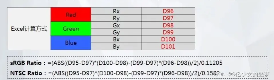 计算方法:我们一般指的是NTSC色域实际的色域三角形面积/标准NSC面积,Excel计算or网上下小软件计算: