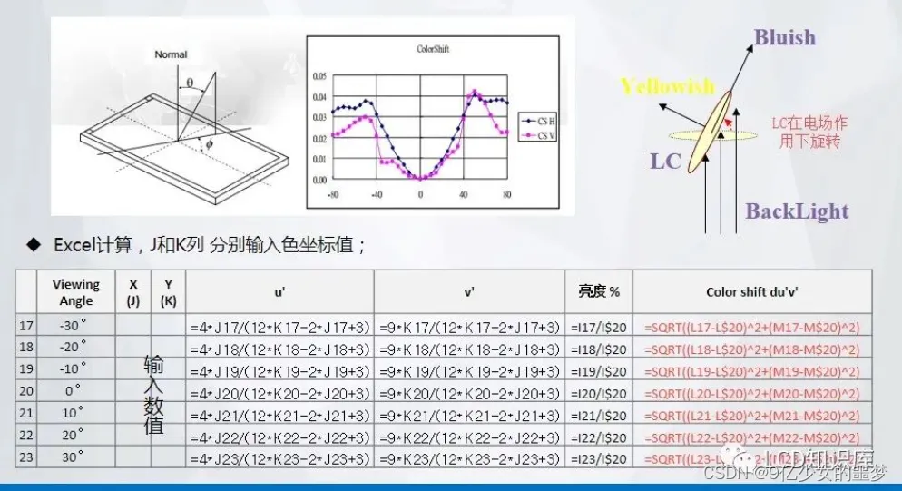 色偏是指随着视角变化,光的色度发生异常,其评价的是不同视角下颜色的变化差异原因:随着视角变化,LC分子dAn发生变化,与LC分子在电场作用下的旋转方向有关