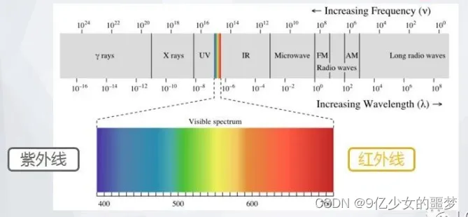 可见光是电磁波谱中的一小部分。空间中弥漫着各种各样的电磁波人眼能够觉察的只是一小部分根据人眼共同点,一般可见光波长380-780nm)