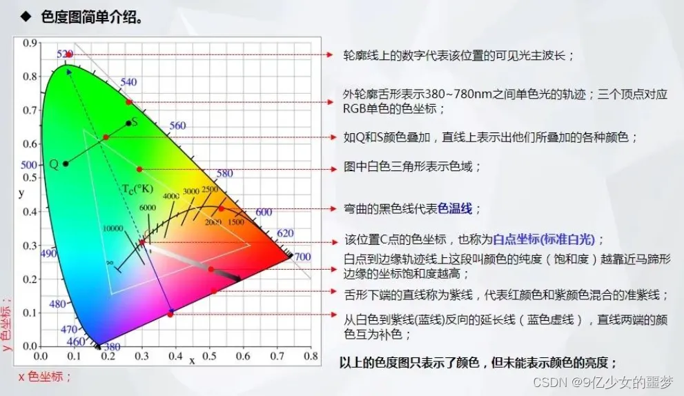 所有颜色向量组成了x>0,y>0,z>0的三维空间第一象限椎;取一个平面x+y+z=1,该截面与三个坐标平面的交线构成一个等边三角形(红色),每一个颜色向量与该平面都有一个交点,每一个点代表一个颜色他的空间坐标(x,y,z)表示为该颜色在标准原色下的三刺激值,称为色度值因此,在XYZ系统中也只要用x,y 两个量就可以表示色度。以下就是我们常见的色度图