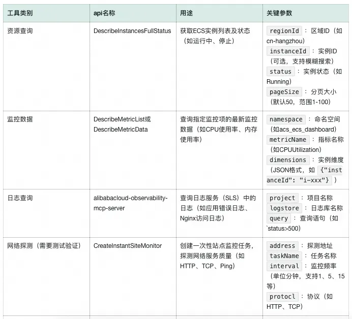 - 用途:调用监控MCP接口查询监控指标数据(如CPU使用率、内存使用率)。