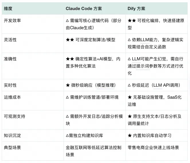 ClaudeCode与Dify由于其特点适用于不同场景,对于需求简单/快速上线可优先使用Dify,需要控制算法/超低延迟则推荐ClaudeCode,在一些复杂场景下80%标准场景+20%定制也可结合起来使用。