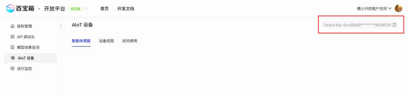 在原协议的基础上增加了 Device-key的参数配置,该参数可登录百宝箱 AIoT 设备页面,从右上角 Device Key除获取。