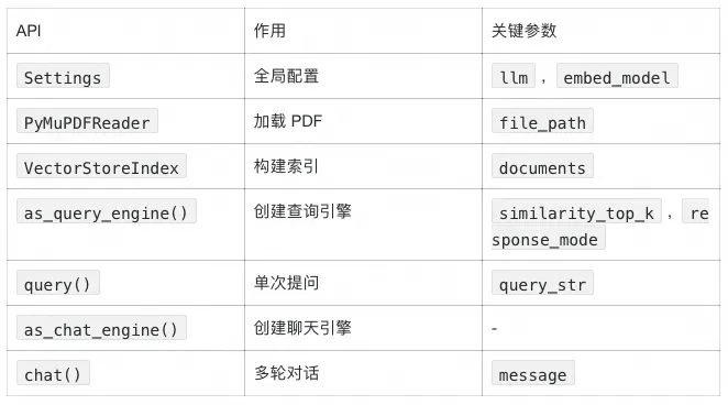 - 5 个关键 API:Settings, Reader, Index, QueryEngine, query()