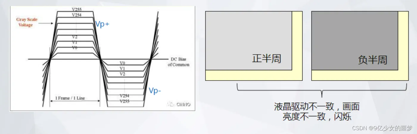 >LCD防止液晶极化在同一灰阶下是交流驱动的,正半周+负半周往复循环,直到画面切换