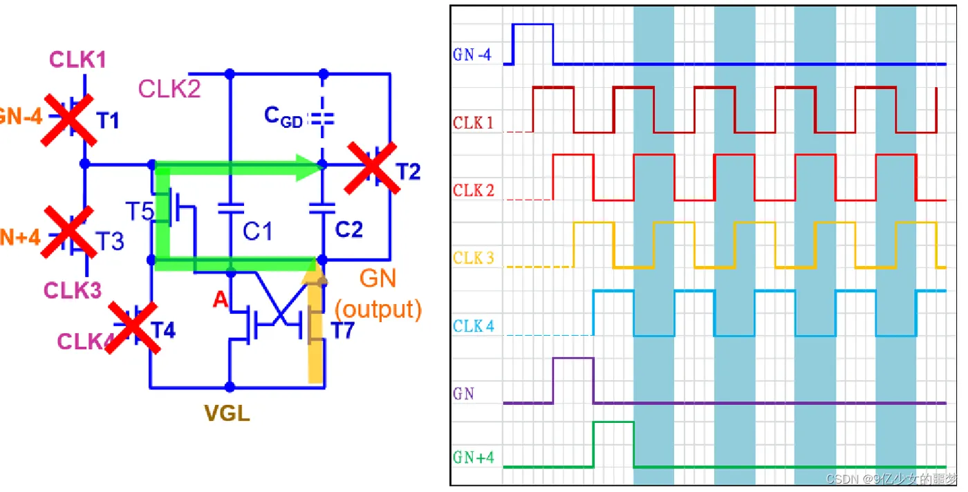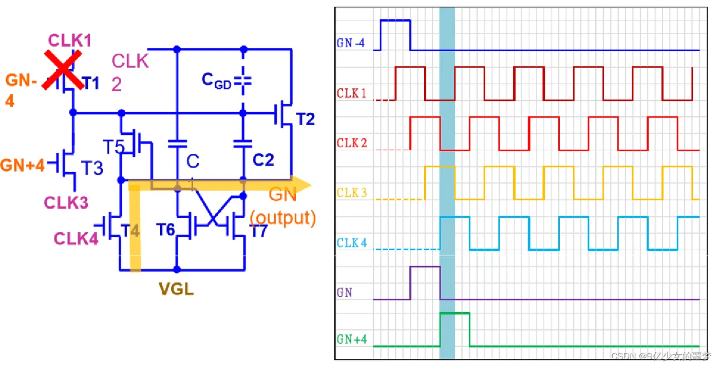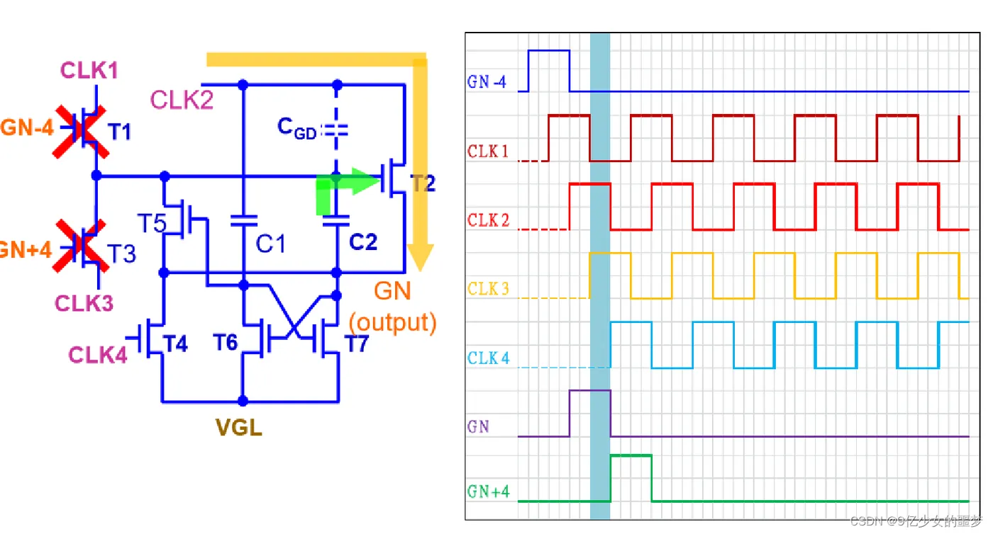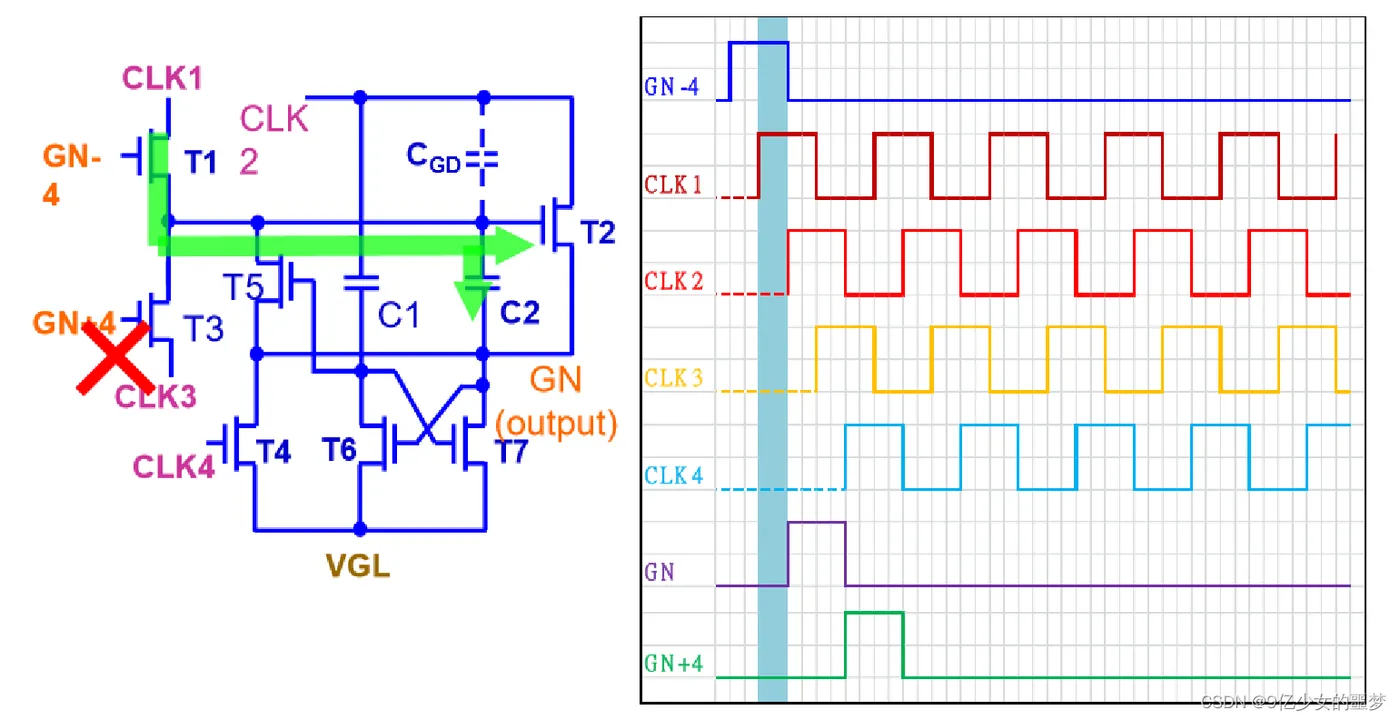 下两级的Gate(GN+4)与CLK4控制GN 拉低的时间。