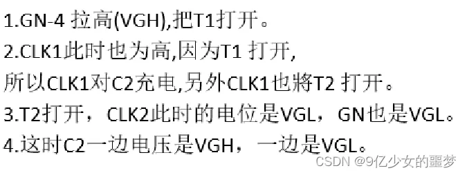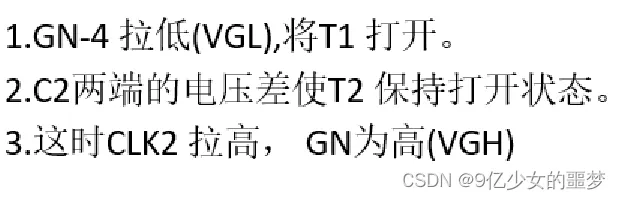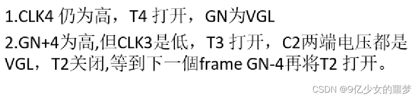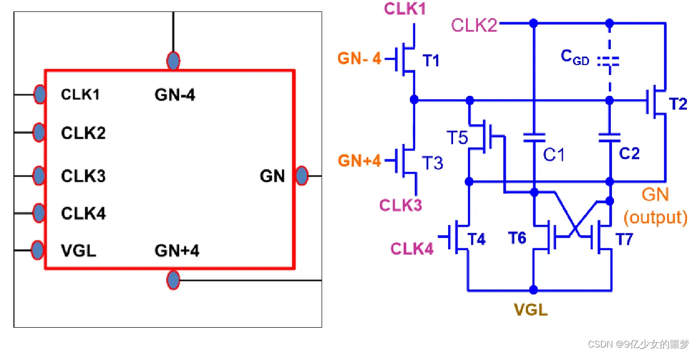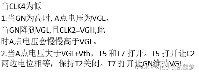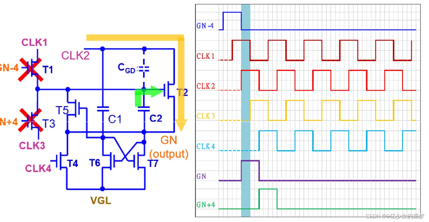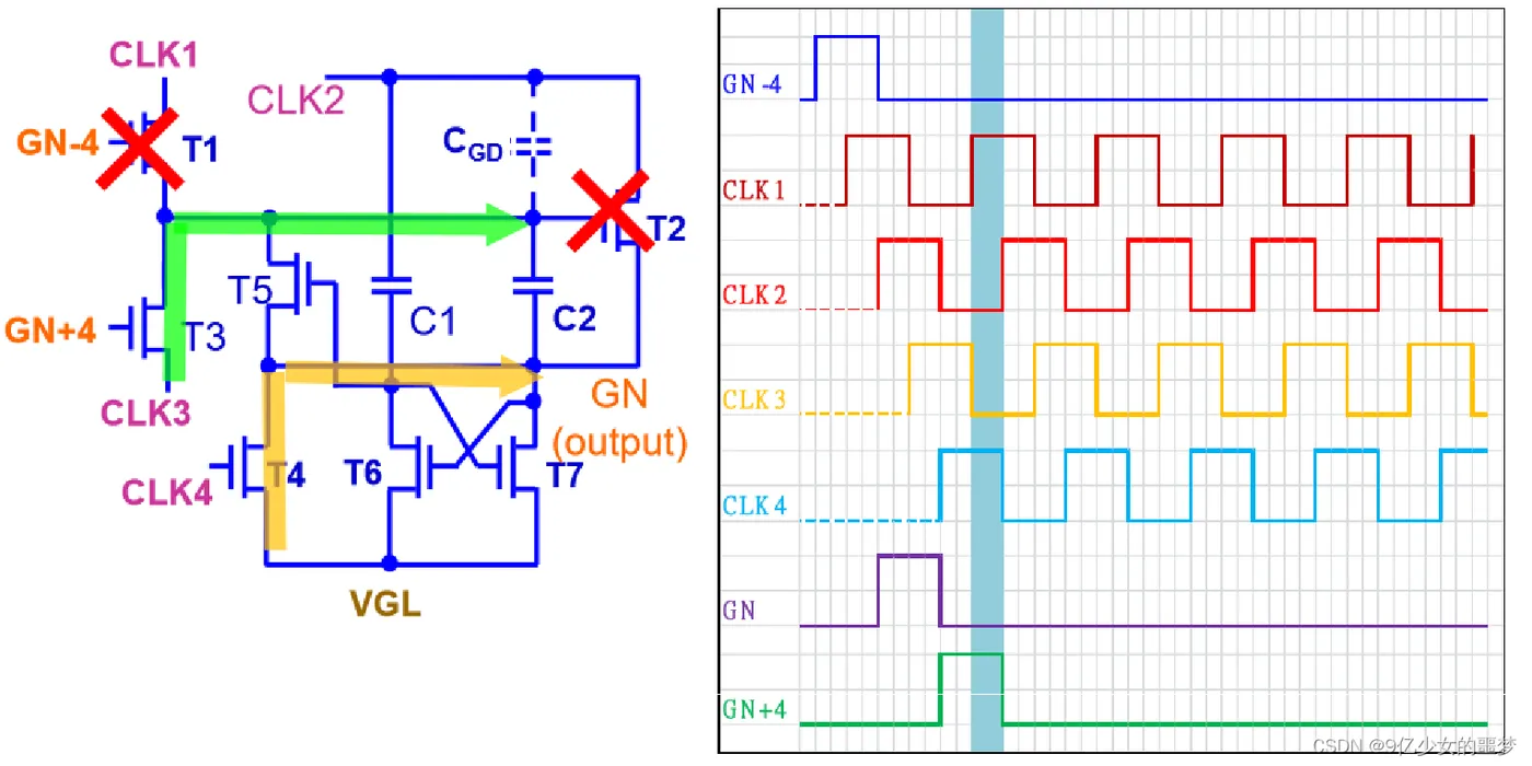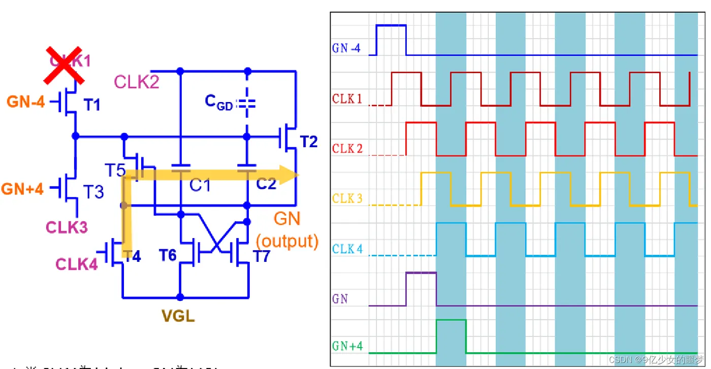 下两级的Gate(GN+4)与CLK4控制GN 拉低的时间。