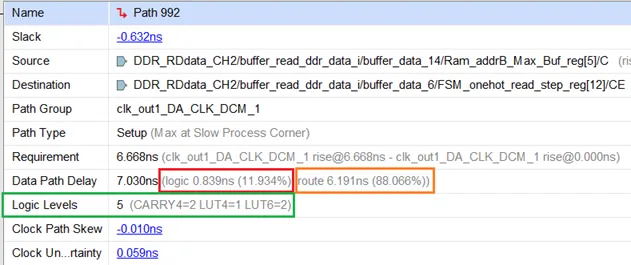 上图这个时序违例的例子,可以看到,该路径逻辑延迟贡献了11.934%的延迟量、路径延迟贡献了88.066%延迟量。该路径逻辑级数为5,经过了2个CARRY4、1个LUT4和2个LUT6。
