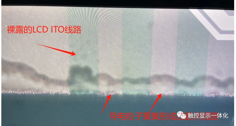 这种导电粒子聚集的情况具有隐患性,如在FOG点亮过程中没有发现异常,等弯折FPC或者挤压绑定FPC处会出现显示异常或大电流的情况。