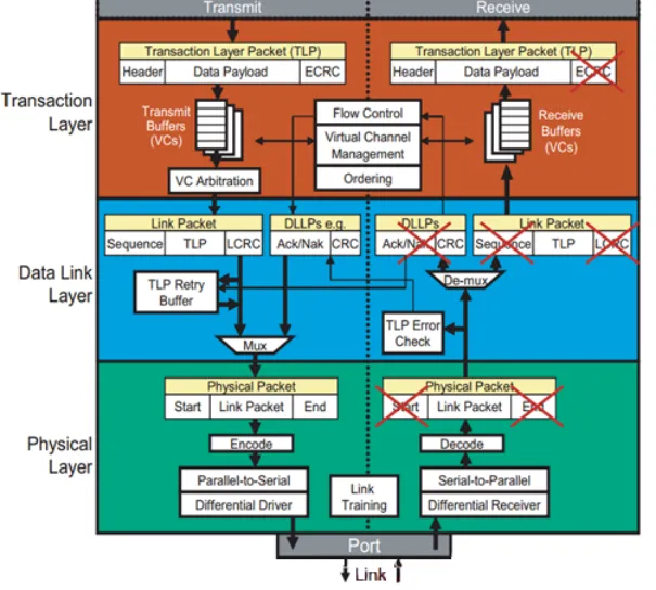 接收方物理层是最先接收到这些数据的,然后执行逆操作;在数据链路层,校验序列号和LCRC;如果检查无误,剥掉序列号和LCRC,往事务层走;如果校验出错,通知对方重传;在事务层,校验ECRC,如果有错则抛弃数据,如果没错,则去掉ECRC,获得数据。