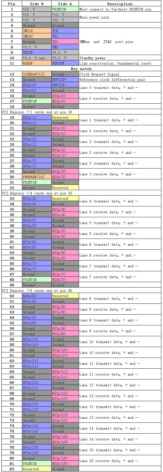 下表列出在边缘连接器上的PCI Express卡两侧的导线。在印刷电路板(PCB)的焊接侧为A侧,并且组件侧的B侧。PRSNT1# 和PRSNT2# 引脚必须比其余稍短,以确保热插入卡时其余管脚完全插入。WAKE# 引脚采用全电压唤醒计算机,但必须拉高从备用电源,以表明该卡是能够唤醒。
