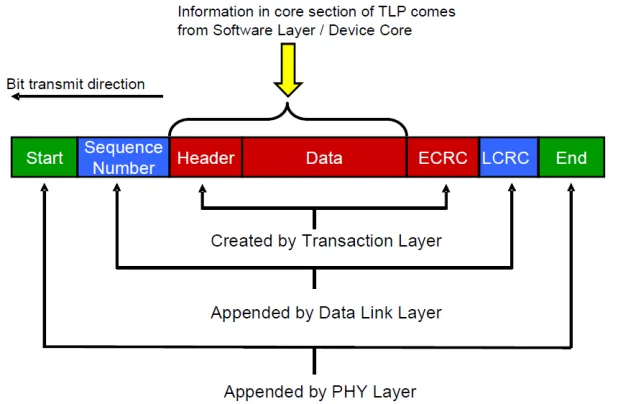 打包后的TLP包格式如下图所示,并且每块数据组成部分来自哪一个协议层都用不同的颜色标出。