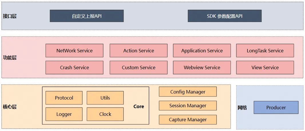 - 功能层:数据采集,具体包含网络、交互、应用、卡顿、崩溃、自定义、Webview、页面、应用等模块。