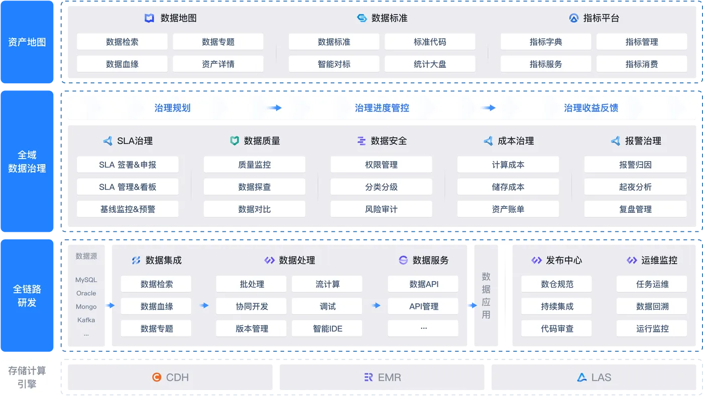 产品以“数据自由流动”为核心,构建了覆盖数据集成、架构、开发、质量、资产、服务的全链路能力。数据集成支持30+异构数据源接入,通过分布式计算框架实现海量数据稳定迁移;数据架构模块提供可视化建模工具,支持关系建模与维度建模,落地统一数据标准。