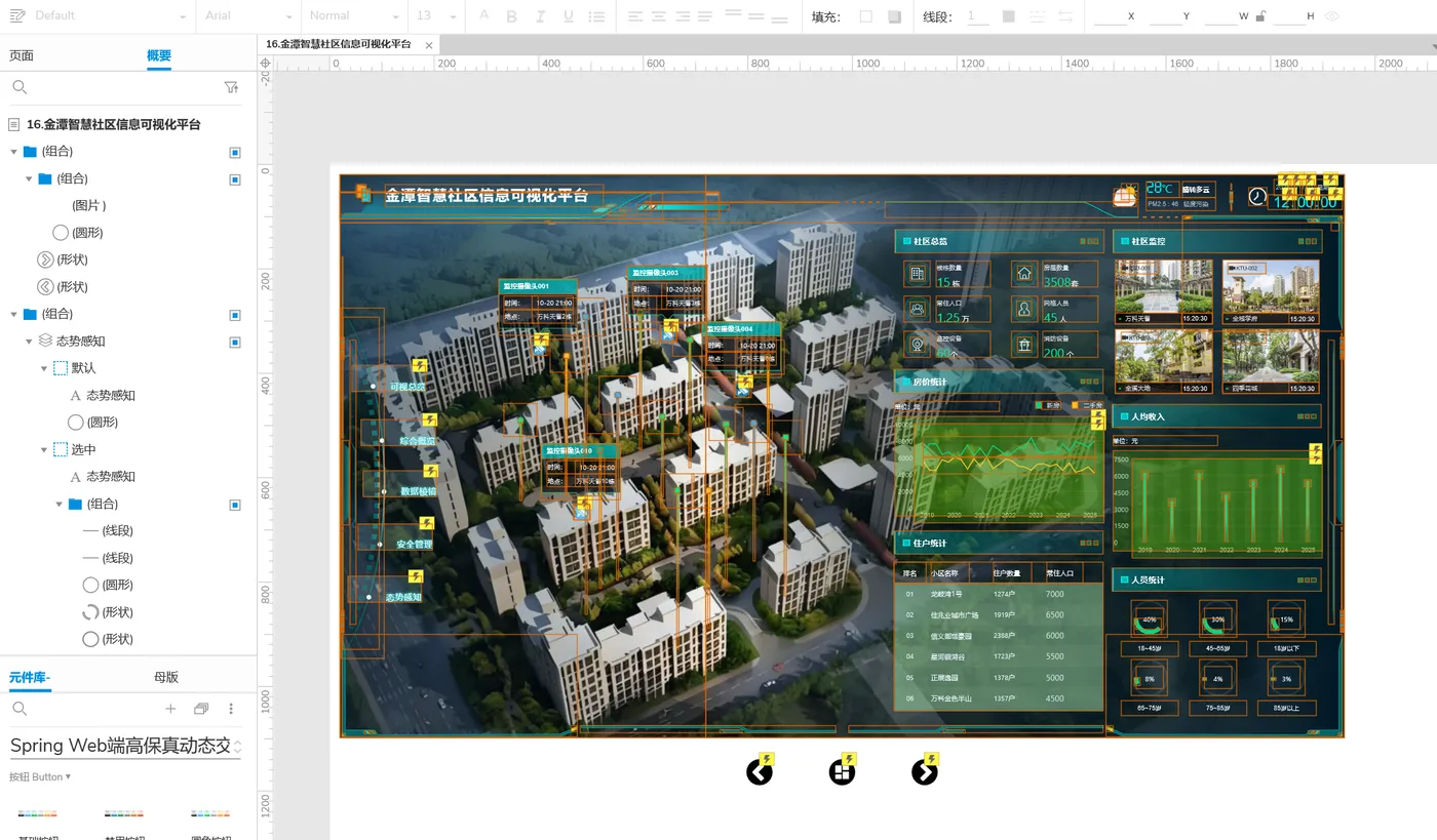 - 元件添加:在各功能区域内添加所需的元件,如文本框、图表、图片等。例如,在社区总览区域添加文本框展示基本信息,在社区监控区域添加图片展示监控画面。