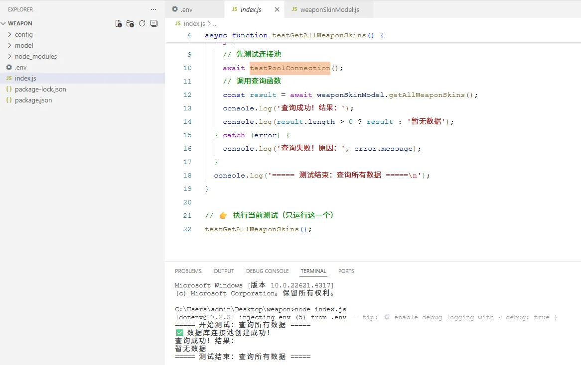 weapon ├─ config/ # 配置文件夹 │ └─ db.js # 数据库连接池配置 ├─ model/ # 数据模型/CRUD 文件夹 │ └─ weaponSkinModel.js # 武器皮肤表 CRUD 逻辑 ├─ .env # 环境变量 ├─ index.js # 入口文件(逐个功能测试) └─ package.json |