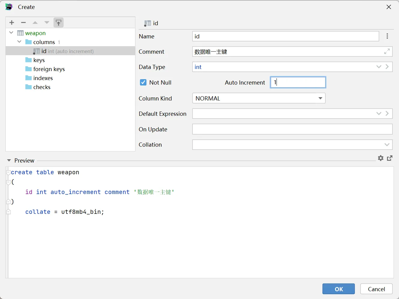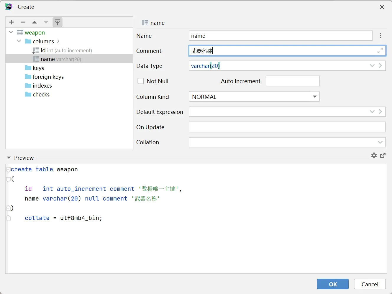 create table tablename( 字段1 字段类型 [约束] [comment 字段1注释], ...... 字段2 字段类型 [约束] [comment 字段2注释] )[comment 表注释];