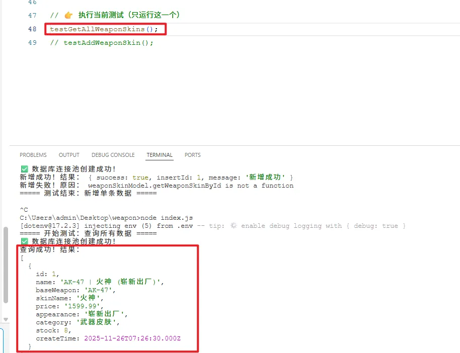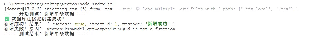 // index.js(新增测试函数) // 👉 测试 2:新增单条数据(对应 addWeaponSkin 功能) async function testAddWeaponSkin() { console.log('===== 开始测试:新增单条数据 ====='); // 测试用数据 const testData = { name: 'AK-47 | 火神 (崭新出厂)', baseWeapon: 'AK-47', skinName: '火神', price: 1599.99, appearance: '崭新出厂', category: '武器皮肤', stock: 8 }; try { await testPoolConnection(); const result = await weaponSkinModel.addWeaponSkin(testData); console.log('新增成功!结果:', result); // 额外验证:查询刚新增的数据 const newData = await weaponSkinModel.getWeaponSkinById(result.insertId); console.log('验证新增数据:', newData); } catch (error) { console.log('新增失败!原因:', error.message); } console.log('===== 测试结束:新增单条数据 =====\n'); } // 👉 执行当前测试(注释掉之前的,只运行这一个) // testGetAllWeaponSkins(); testAddWeaponSkin();