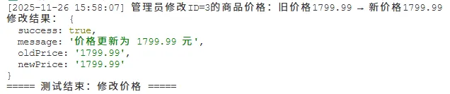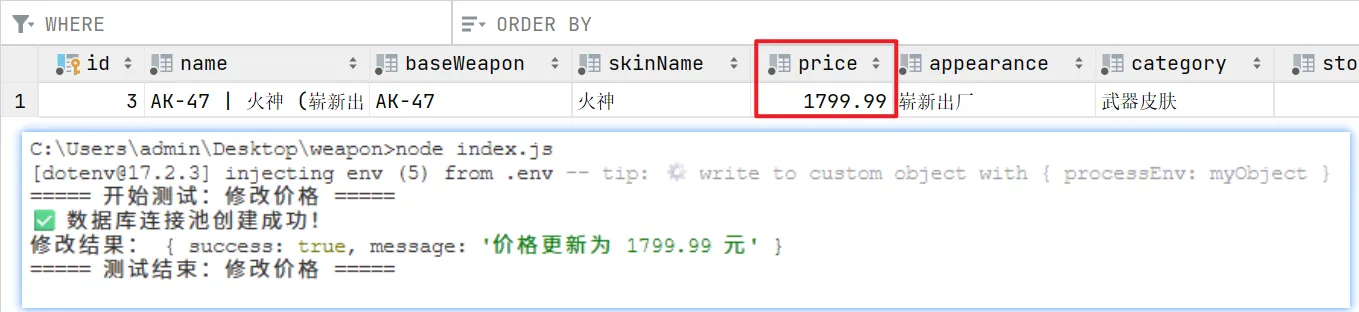 // 👉 测试 4:修改价格(对应 updateWeaponSkinPrice 功能) async function testUpdateWeaponSkinPrice() { console.log('===== 开始测试:修改价格 ====='); const testId = 3; // 实际存在的 ID const newPrice = 1799.99; try { await testPoolConnection(); const result = await weaponSkinModel.updateWeaponSkinPrice(testId, newPrice); console.log('修改结果:', result); } catch (error) { console.log('修改失败!原因:', error.message); } console.log('===== 测试结束:修改价格 =====\n'); } // 👉 执行当前测试(只运行这一个) // testGetAllWeaponSkins(); // testAddWeaponSkin(); // testDeleteWeaponSkin(1); testUpdateWeaponSkinPrice();