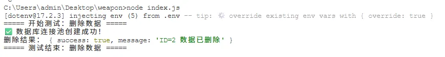 // index.js(新增测试函数) // 👉 测试 3:删除数据(对应 deleteWeaponSkin 功能) async function testDeleteWeaponSkin() { console.log('===== 开始测试:删除数据 ====='); try { await testPoolConnection(); // 执行删除:这里的id需要跟数据库保持一致 const result = await weaponSkinModel.deleteWeaponSkin(2); console.log('删除结果:', result); } catch (error) { console.log('删除失败!原因:', error.message); } console.log('===== 测试结束:删除数据 =====\n'); } // 👉 执行当前测试 testDeleteWeaponSkin();