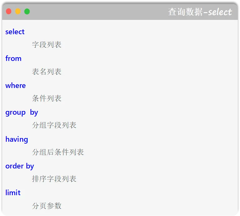 select 字段 from 表名 [where 条件] [order by 排序字段] limit 起始索引,查询记录数;