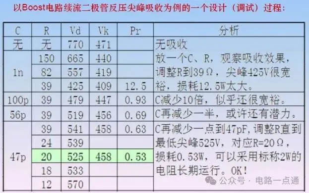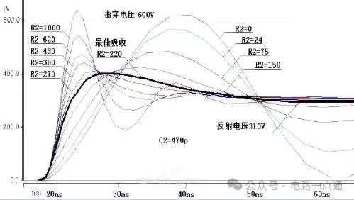 对应一个特定的吸收环境和一个特定大小的电容C,有一个最合适大小的电阻R,形成最大的阻尼、获得最低的电压尖峰。