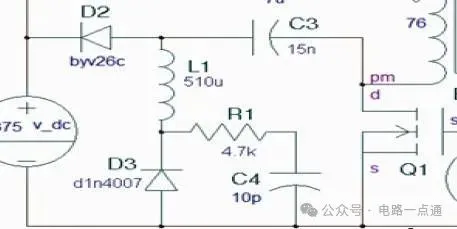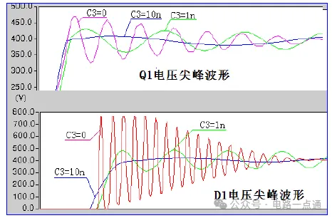 同时将Q1、D1的电压尖峰、振铃减少到最低程度。