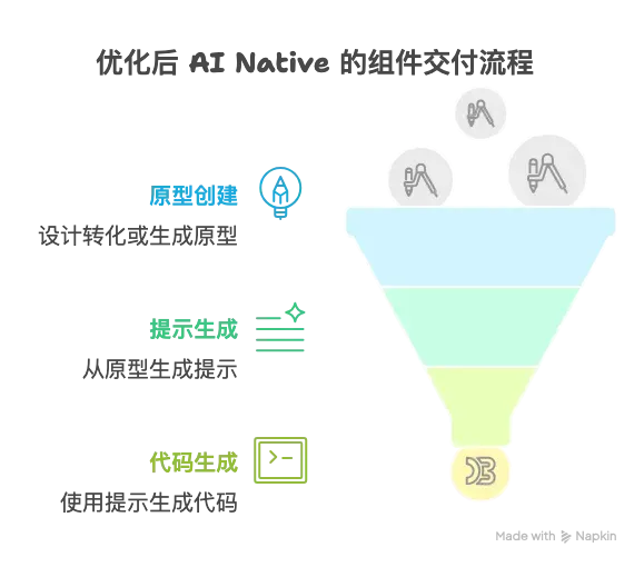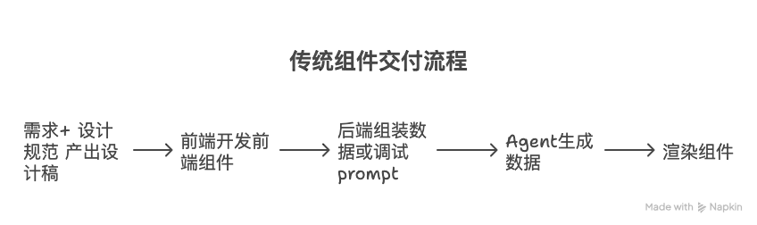 传统的组件交付流程: 设计师根据需求产出设计稿,前端开发者拿到设计稿后开发前端组件,然后组装对应的数据或调试prompt让Agent生成组件所需的数据来渲染组件。