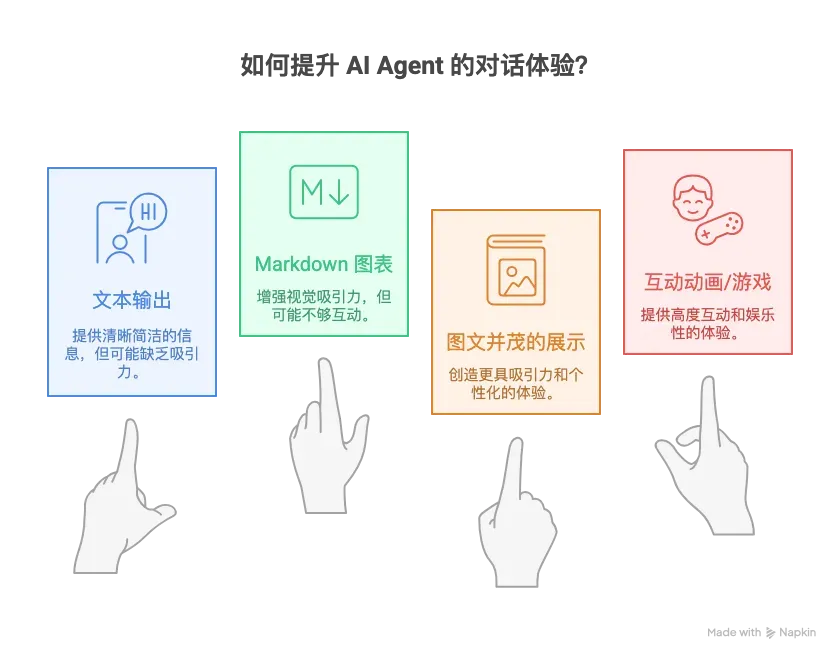 最近我们在尝试能否大幅提升 AI 或者 Agent 和用户的对话体验。现在市面上千篇一律的 Agent 对话, Agent 只是输出文本,高级一点就是输出 markdown 支持的一些图表来实时展示。用户往往面对一长串文字感到疲惫甚至反感。我们希望能让用户(比如淘宝的消费者、支付宝的用户)和 Agent 对话后,Agent 直接给出图文并茂,类似精修过的 PPT的展示。更进一步,Agent 实时给出个性化的、可交互的小动画、小游戏。让用户和产品的每次对话都更有趣,更感到自己被尊重。