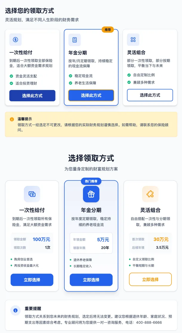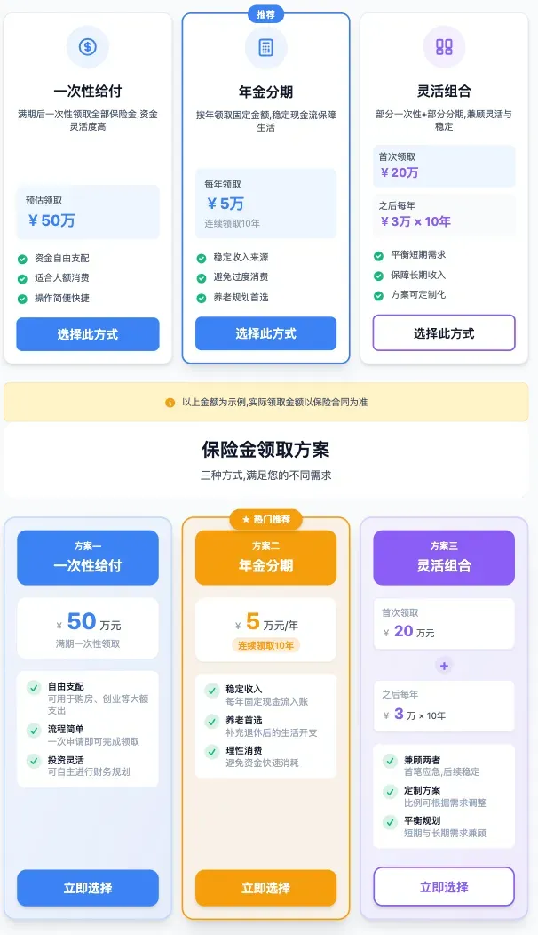 ### 1. 一次性给付 (Lump-Sum Payout) 条款说明: 保险期满后,受益人一次性领取保险金100万元。 扩展分析: * 核心优势:资金灵活度最高。 这是最直接、最简单的给付方式。受益人立即获得对全部资金的完全控制权。 * 适合场景: * 偿还大额债务: 如剩余的房屋贷款、车贷或其他大额借款。 * 重大资本支出: 如购买房产的首付款、子女的海外教育启动资金、创业启动金等。 * 大额医疗支出: 应对突发的、不在其他保险(如医疗险、重疾险)覆盖范围内的高额医疗或康复费用。 * 潜在风险/考量: * 投资风险: 受益人需要具备一定的理财能力。如果投资决策失误,可能导致本金损失,失去保险本应提供的长期保障意义。 * 通胀风险: 100万元在领取时可能是一笔巨款,但随着时间推移,其购买力会因通货膨胀而下降。 * 消费失控: 缺乏自制力的人群可能会在短期内将资金挥霍一空,导致"英年早逝"的保险金未能实现长期财务目标。 * 操作便捷性: 流程最简单,提交理赔资料审核通过后,保险公司一次性划款,合同终止。 ### 2. 年金分期 (Annuity Payout) 条款说明: 保险期满后,每年领取10万元,连续领取10年。总计领取 $10 \text{万元} \times 10 = 100 \text{万元}$。 扩展分析: * 核心优势:提供稳定、可预期的现金流。 这种方式将一笔钱"拉长"成10年的稳定收入,如同"强制储蓄"和"月退/年退"。 * 适合场景: * 养老规划首选: 对于退休人士而言,这笔钱可以完美补充养老金,确保未来10年每年都有一笔固定的生活费或旅游基金,极大提升晚年生活品质。 * 子女教育金: 如果保险到期时子女正要上大学或研究生,每年10万元可以稳定地覆盖学费和生活费,分摊教育开支压力。 * 风险厌恶者: 适合不擅长理财、担心一次性拿到钱会乱花或被骗的受益人。 * 潜在风险/考量: * 灵活性缺失: 在这10年内,如果受益人突遇紧急情况(如需手术)需要大笔资金,无法一次性取出剩余未领取的保险金。 * 机会成本: 未领取的资金通常由保险公司管理,其增值(如果有的话)可能低于受益人自己进行稳健投资的收益。 * 通胀影响: 每年领取的10万元,在第10年时的实际购买力会低于第1年。 * 实现方式: 满期金转入年金账户,保险公司按合同约定逐年给付。 ### 3. 灵活组合 (Combined Payout) > 条款说明: 保险期满后,首次领取40万元,之后每年领取6万元,连续领取10年。总计领取 $40 \text{万元} + (6 \text{万元} \times 10) = 100 \text{万元}$。 扩展分析: * 核心优势:平衡短期需求与长期保障。 这是对前两种方案的折中与优化,兼顾了灵活性和稳定性。 * 适合场景: * 多重目标家庭: 首次领取的40万元可用于"即时满足",如房屋装修、更换新车或偿还部分紧急债务。 * 过渡期规划: 刚退休时,可能需要一笔钱来调整生活(如旅居、发展爱好),40万提供了启动资金;后续每年6万则保障了基础生活费。 * 教育与生活兼顾: 40万可用作子女出国保证金或首年费用,后续每年6万作为其留学期间的补充生活费。 * 潜在风险/考量: * "两头不靠": 首次领取的40万可能不足以覆盖真正的大额支出(如购房首付);每年6万的现金流(平均每月5000元)作为生活补充尚可,但作为主要收入来源可能偏低。 * 定制化复杂度: 这类方案可能需要更精细的财务规划,确保40万和每年6万都能用在"刀刃"上。 * 定制化潜力: 这是最具"可定制性"的方案。在投保或满期时,可以协商调整首次领取的金额和后续年金的比例(例如,首次领20万,后续10年每年领8万)。