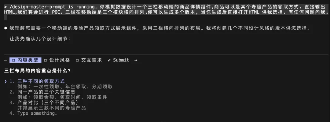 请你充分理解当前设计规范 @xxx 生成 design-master-prompt.md .遵循 prompt 工程最佳实践。 我希望后续通过这个 prompt 让 AI 设计出的组件符合设计规范。我的使用场景比如: ------ /design-master-prompt 你模拟数据设计一个三栏移动端的商品详情组件,商品可以是某个寿险产品的领取方式. 直接输出 HTML,我们将会进行 POC. 三栏在移动端是三个模块横向排列.你可以生成多个版本, 当你生成后直接打开HTML 供我选择。 ------ 如果有任何不清楚的,请你向我确认。