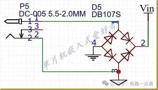 如上图,电路中接入整流桥,这样输入电路不管怎么接,都不会引起后级电路电源接反。此电路的缺点就是需要消耗1.4V左右的二极管压降。如果电路中电流过大,那么整流桥也会消耗过多的功率,导致其发热。功率消耗过大。