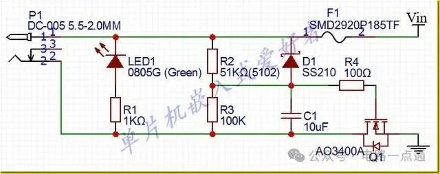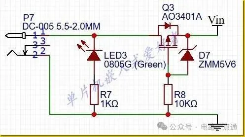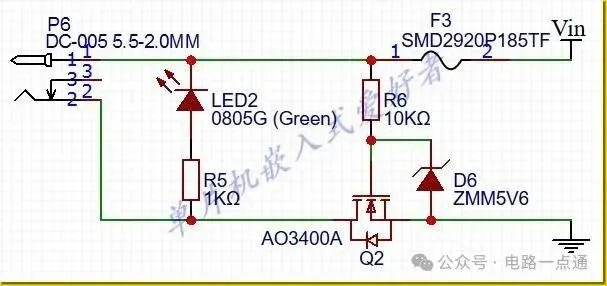 当电源电压接反时,NMOS不导通,MOS管是截止的。从而保护后级电路的安全,图中的R5和LED2为,如果电源接入反向电压,那么LED2指示电源接反。R6和D6是为了确保电源接入正确时,更好的保证MOS管导通,如果省去稳压二极管D6,则有可能由于输入电压过高导致超过MOS管的Vgs最大值,从而容易使MOS管损耗。加入稳压管也是更好的保护MOS管。