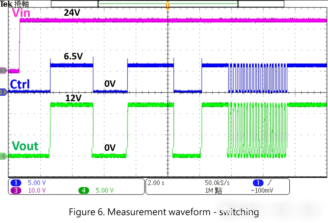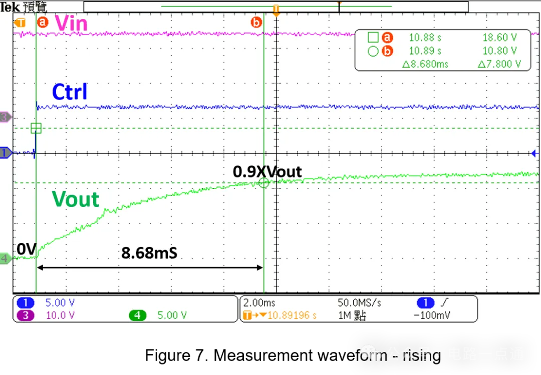 图6为实际测量的信号,包括转换器的输入电压、输出电压和控制信号电压。当工作在正逻辑模式时,控制电压为6.5V,超过了最小开启电压。因此,电源转换器被激活并正常工作。但是,观察到当控制信号电压增加到3.5V时,转换器的上升时间为8.68毫秒,此时输出电压变为规格值的0.9倍。