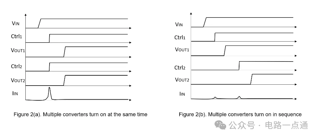 当系统中的多个电源同时启动时,输入功率会快速对输入电容充电。此过程会产生大量浪涌电流,可能对元件造成破坏性损坏。使用远程控制可有效错开各个电源转换器的启动时间,从而减少输入电流瞬变。对于开关转换器,此方法是防止浪涌电流最有效的方法之一。图 2(a) 说明,当转换器 1 和转换器 2 同时启动时,输入浪涌电流急剧上升。相比之下,图 2(b) 说明,当转换器 1 和转换器 2 依次启动时,输入电流中仅出现两个微小的尖峰,峰值明显低于前一种情况。