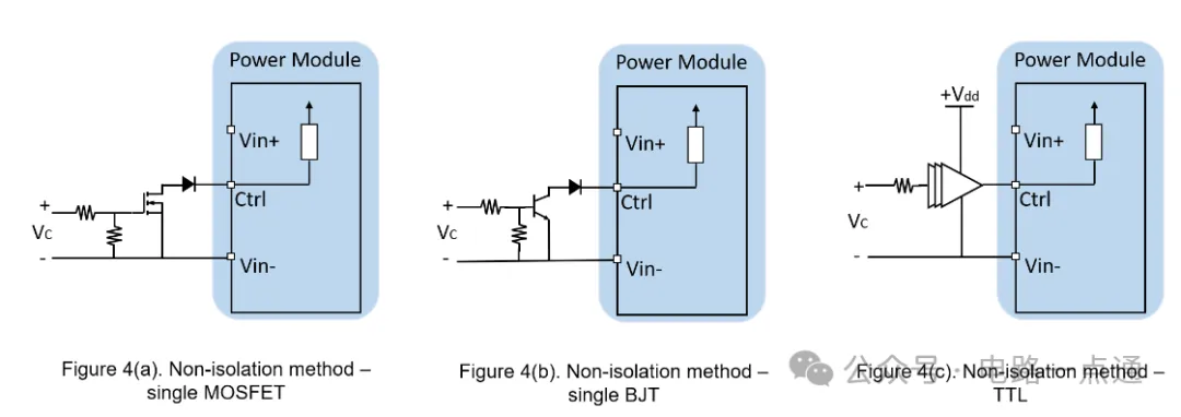根据控制模式,需要选择合适的外部电路。这些外部电路分为隔离型和非隔离型。图4显示了推荐的用于远程控制的非隔离外部电路。如图4(a)(b)所示,一般开关元件采用N型MOS或NPN型BJT。实际操作时,需要串联正向二极管,以防止Ctrl电压受到外部噪声干扰,从而导致操作错误。另一种方法是使用晶体管-晶体管逻辑(TTL)电路来驱动Ctrl引脚,如图4(c)所示。