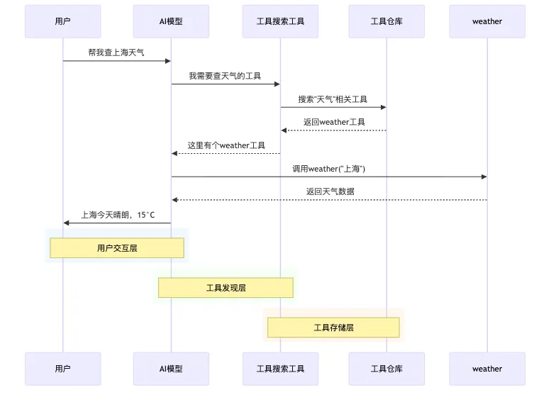 currentTime - AI: "知道时间了,现在需要天气工具" → 发现并获取