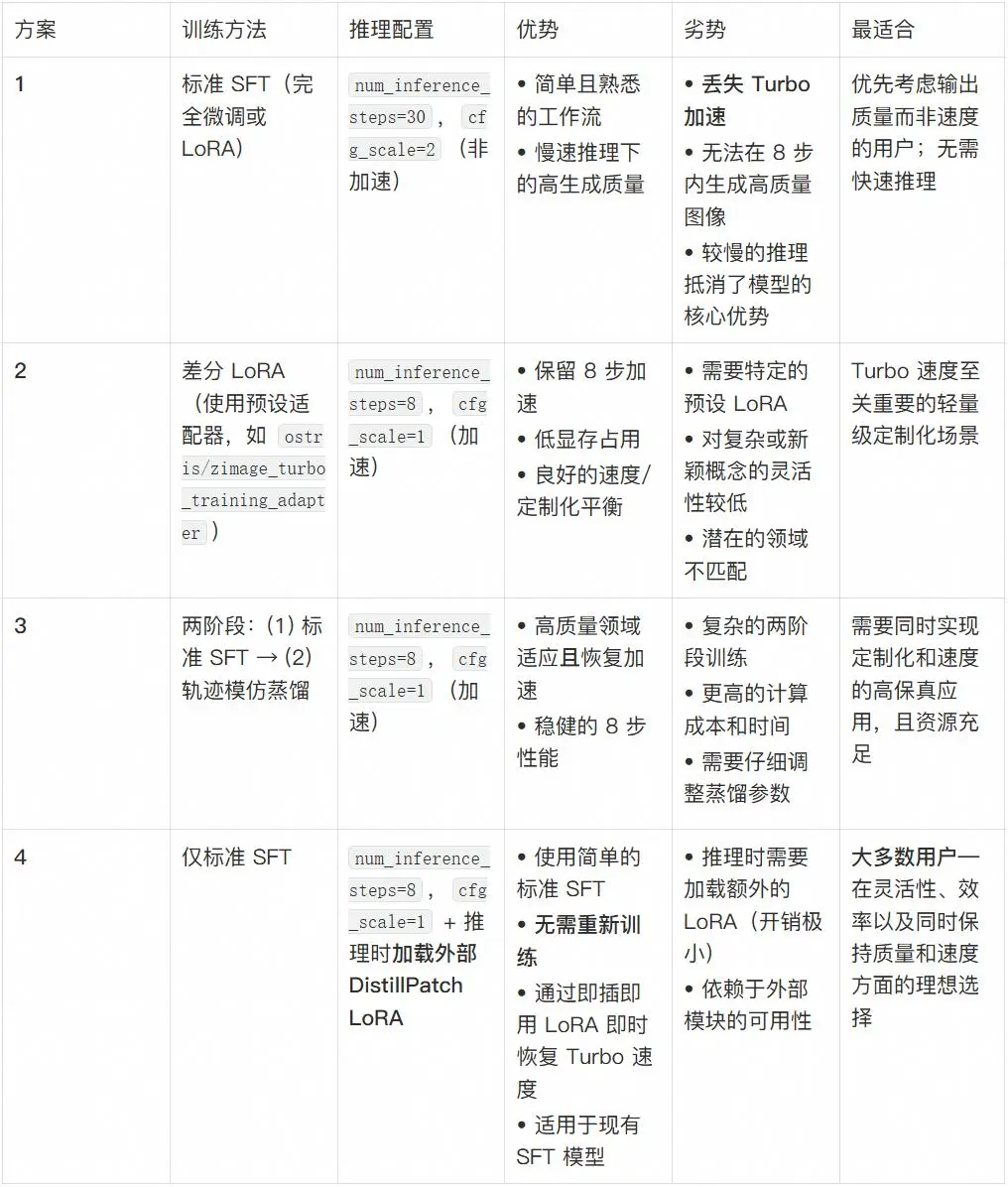 方案4 提供了最佳权衡:您可以保持标准 SFT 的简洁性和强大功能,同时通过在推理时加载官方 Z-Image-Turbo-DistillPatch LoRA 轻松恢复 Turbo 加速。这种即插即用的方法无需重新训练,支持现有模型,并能提供高质量的 8 步生成,使其成为最实用且可扩展的选择。