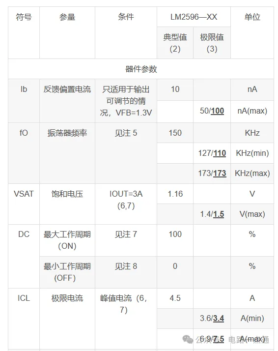 说明:标准字体对应的项目适合于 TJ=25℃时,带下划线的粗斜体字对应的项目适合于整个温度范围。除非特别说明,VIN=12V对应于LM2596—3.3、LM2596—5.0、LM2596—ADJ,VIN=24V 对应于LM2596—12.ILOAD=500mA。(见注 14)