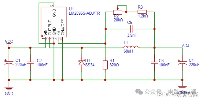 LM2596开关电压调节器是降压型电源管理单片集成电路,能够输出最大3A的驱动电流,同时具有很好的线性和负载调节特性。芯片按照输出版本可分为四种,分别是3.3V、5V、12V、ADJ(可调版本),其中ADJ(可调版本)可以输出小于37V的各种电压(注意在ADJ电路的搭建中,一定要接可调电阻(例如滑动变阻器、电位器等)才行,因为输出电压的变化是通过调节电阻实现的)。