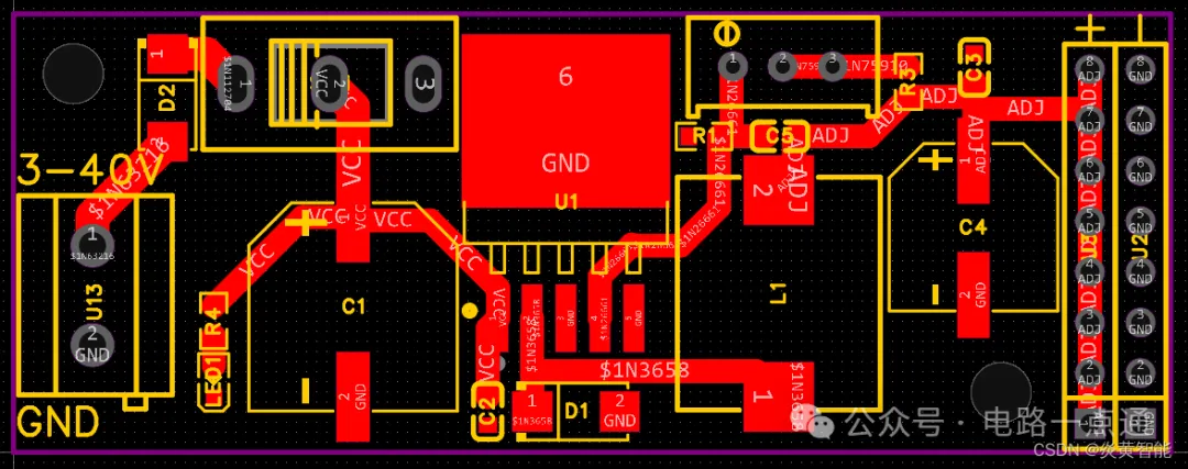 注:(1)反馈线要远离电感;(2)要粗要短的线路:引脚1和电容正极、引脚2和肖特基二极管阴极、引脚2和电感、电感另一端和输出端的电容正极(负极直接铺铜);(3)调节输出电压的电阻R1、R2要靠近LM2596的4脚。