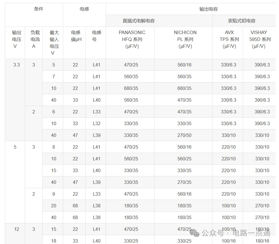 我们的设计条件是VOUT=5V,VIN(MAX)=12V,ILOAD(MAX)=3A。因为表中没有12V输出电压,我们可以选择略微大一点的15V电压。根据上表,可选择的输出电容有四种,分别为直插式电解电容PANASONIC HFQ系列330μF/35V规格、NICHICON PL系列330μF/35V规格、AVX TPS系列220μF/10V规格、VISHAY 595D系列330μF/10V规格。我们任选其一即可。(其实这个表格是芯片官方提供的资料,是快速选型查阅表。