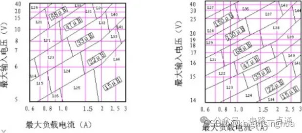 因为我们的设计条件是VOUT=5V,VIN(MAX)=12V,ILOAD(MAX)=3A。输出5V的话,可直接查看图9(LM2596-5.0)。最大负载电流3A,最大输入电压12V,直接找到图中对应的横纵坐标点为(3,12),对应的区域为L40,电感值为33UH(你知道为什么横坐标最大是3,纵坐标最大是40吗?因为芯片的最大负载电流就是3A,最大输入电压是40V,比这个再大的话,芯片就烧了)