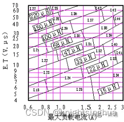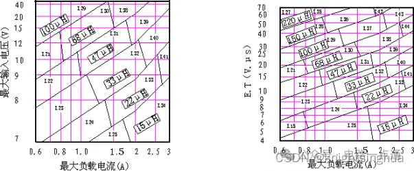 由上图34(V·μs)的水平线和 3A 的垂直线的交叉处所确定的电感为 47μH,电感代号为 L39。